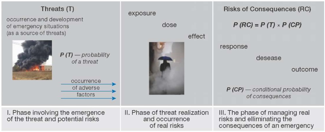 The phase of managing real risks and eliminating the consequences of an emergency (III) involves the provision of medical and sanitary assistance, which is intended to prevent and eliminate damage to health. For example, when the body is exposed to chemicals, the conceptual apparatus of the phase includes “response, disease, and outcome.”