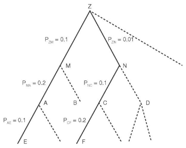 Let us transform the event tree into a probability graph, where the edges of the tree are the probabilities of chain events (Fig. 3).
