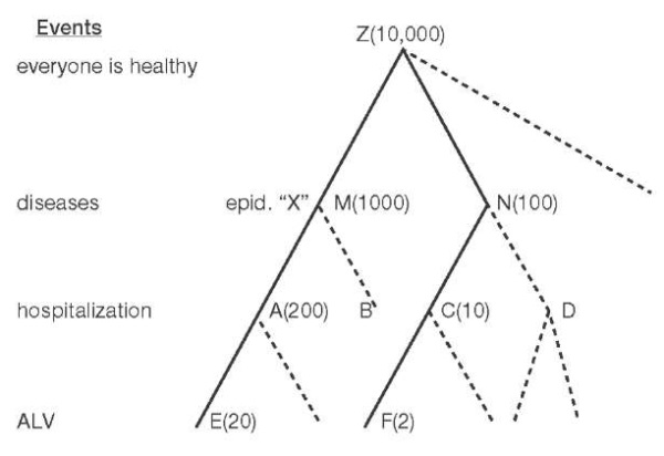 Note: the number in parentheses indicates the number of people involved in elementary events: those who are ill, hospitalized, and placed on ALV; the dashed line represents a transition to alternative and/or insignificant events to be considered.