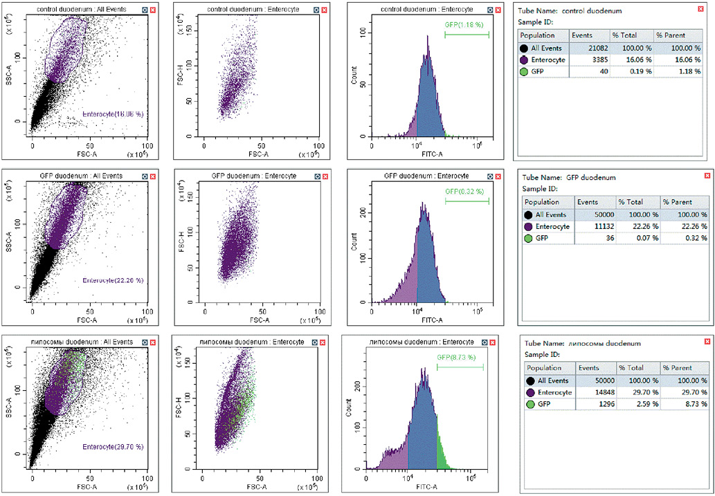 В образцах клеток кишечника, полученных от животных из группы, получивших GFP в липосомах, наблюдали существенное увеличение событий, соответствующих свечению GFP, — до 8–10% от родительской популяции клеток (рис. 3В).