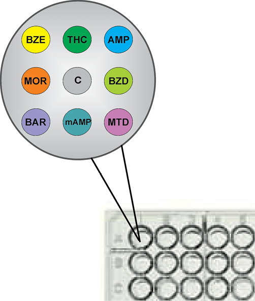 Fig. 1. Layout of immunochip microarrays at the well bottom of 96-well microplates: BZE (cocaine); THC (cannabinoids); AMP (amphetamine); MOR (opiates); BZD (benzodiazepines); BAR (barbiturates); mAMP (methamphetamine); MTD (methadone); C (control)