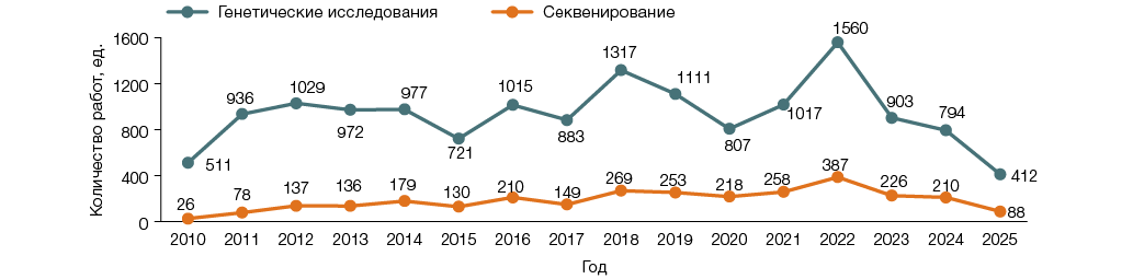 Актуальность темы обусловлена высоким объемом накопленных в результате исследований генетических и иммунологических данных человека, необходимостью их систематизации и обеспечения доступности для научного сообщества. Так, на территории Российской Федерации, по данным домена «Наука и инновации»1, в период 2010–2025 гг. было зафиксировано около 15 000 научно-исследовательских работ, в которых упоминались генетические технологии, и около 3000 научно-исследовательских работ, упоминающих секвенирование; соответствующие данные представлены на рисунке.