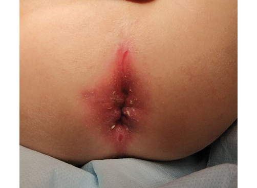 Очередное ухудшение состояния отмечено в июле 2017 г., ребенок был госпитализирован в гастроэнтерологическое отделение Морозовской ДГКБ (МДГКБ). При осмотре: в области ануса визуализировано свищевое отверстие с гнойным отделяемым, перианальный дерматит, сопровождающийся мокнутием, анальная трещина (рис. 1).