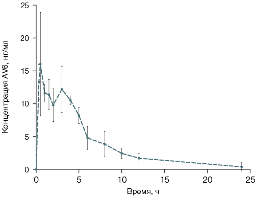 Рис. 1. График зависимости концентрации соединения в плазме крови крыс от времени после однократного внутрижелудочного введения AV6