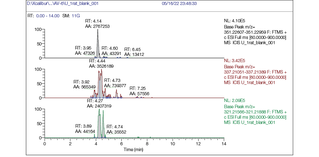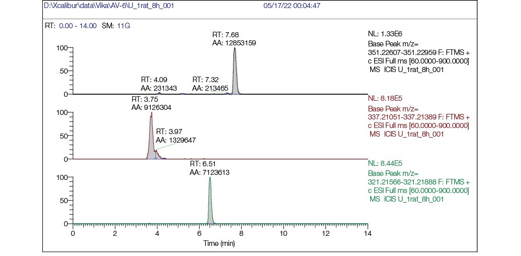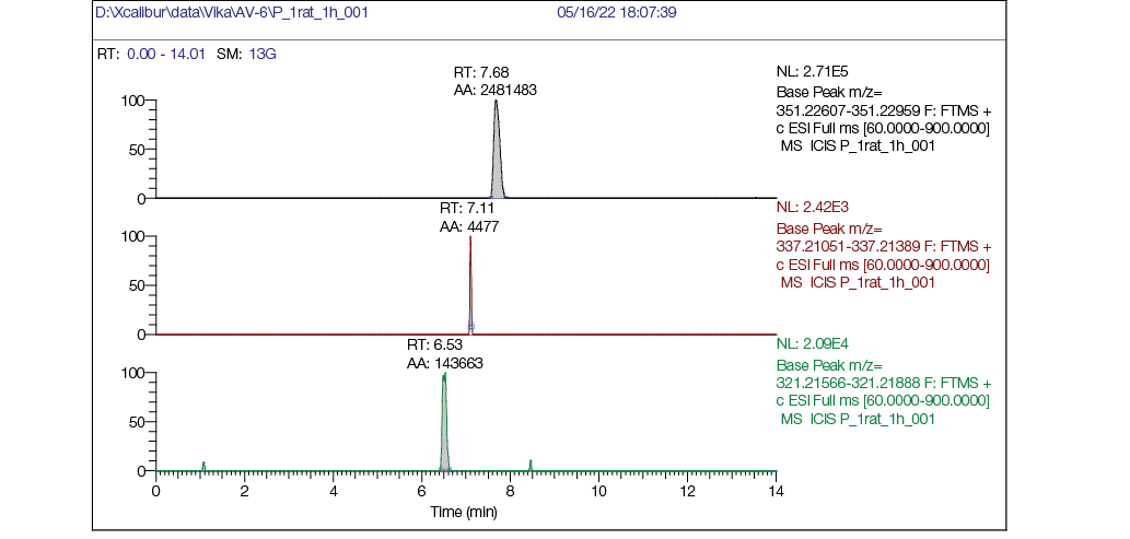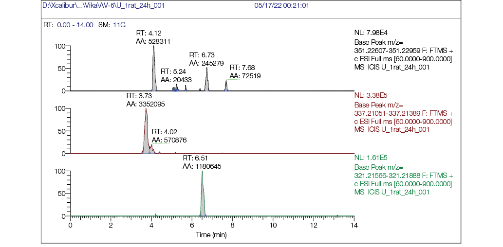 На этом этапе работы получены данные о двух основных метаболитах. На рисунках 2–4 представлены хроматограммы образцов плазмы крови подопытных животных. В образцах, кроме исходного вещества, выявлены его метаболиты M1 и M2.