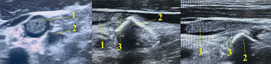 Fig. 3. Left neck ultrasound: 1 — floating thrombus in the lumen of the internal jugular vein; 2 — metallic foreign body (fragment) penetrating the lumen of the internal jugular vein; 3 — site of attachment of the floating thrombus to the metallic foreign body (fragment)