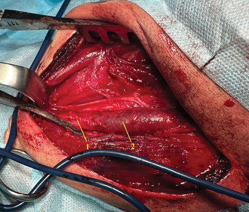 Fig. 5. Final result of the operation: 1 — closure of the venotomy site on the anterior wall of the internal jugular vein; 2 — internal jugular vein proximal to the site of reconstruction