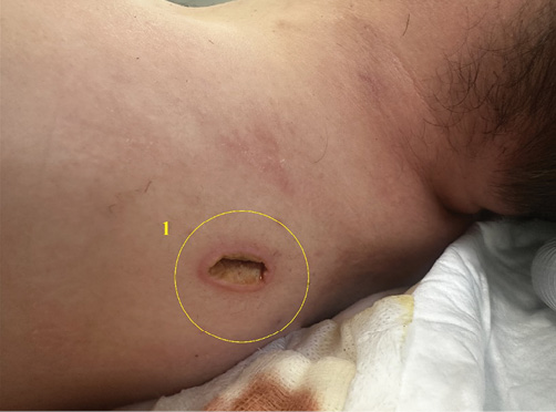 Local findings: A 2 cm lacerated wound on the posterior surface of the left shoulder with scant serosanguineous discharge (Fig. 1).